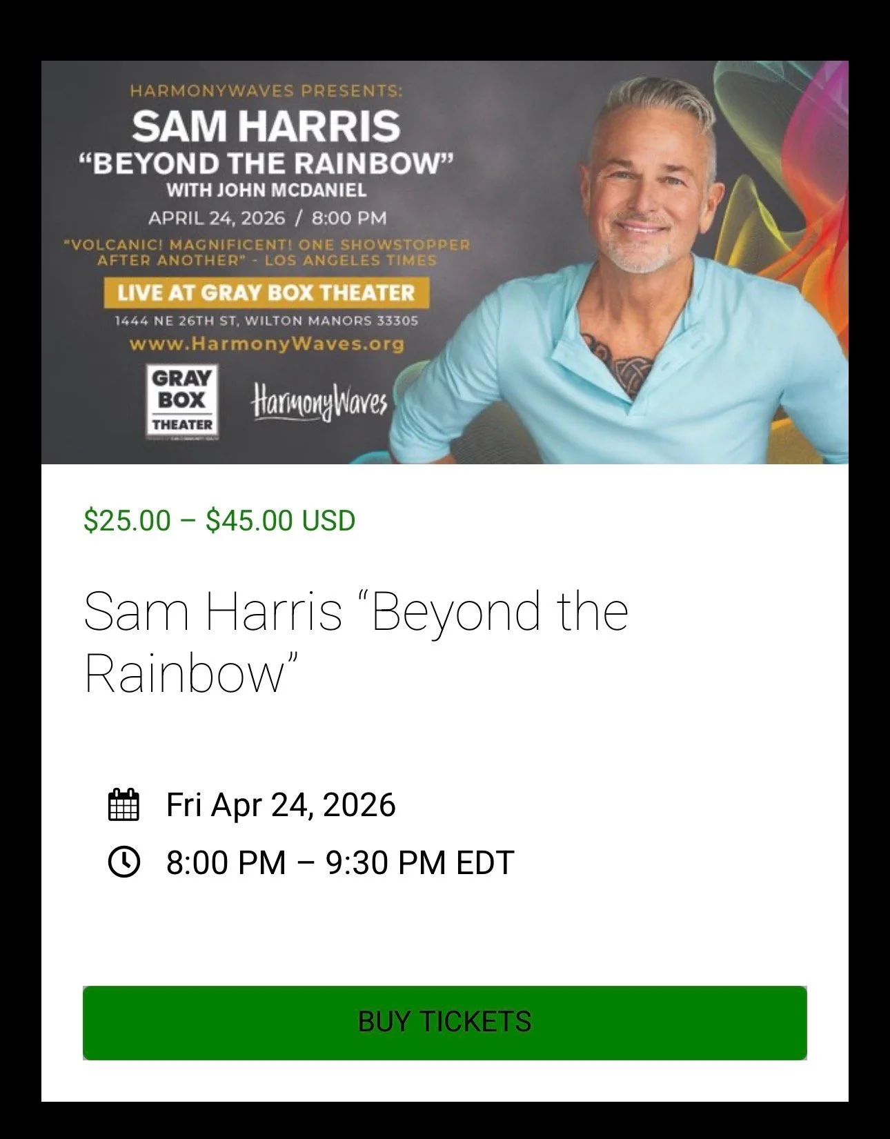 In “Beyond the Rainbow,” Sam Harris bares his heart and soul in an unforgettable evening of powerhouse vocals, intimate storytelling, and razor-sharp wit. The title pays tribute to his legendary rendition of “Somewhere Over the Rainbow,” the performance that captivated 25 million viewers weekly and launched his meteoric career on Star Search — the groundbreaking competition that paved the way for shows like American Idol and The Voice.